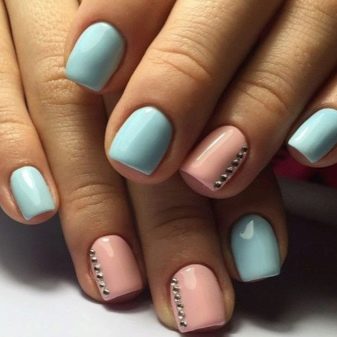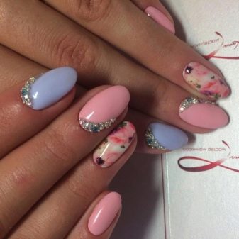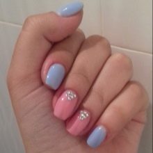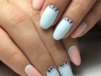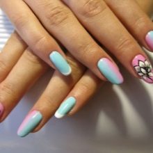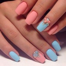 Per obtenir un disseny inusual d’ungles, els amos prefereixen combinar el blau amb altres tons de l’esquema de colors. Una bona elecció són les composicions fetes en colors rosat i blau.Tenen una gran demanda a la primavera i a l’estiu, tenen un aspecte excel·lent en els aspectes quotidians i nocturns. També podeu diluir la manicura “celestial” amb colors rosats a la tardor: ajudaran a ocultar l’atmosfera de somnolència causada pels dies ennuvolats i el fred. Es recomana dissenyar delicats per decorar amb dibuixos i dibuixos gràfics en forma de flors.