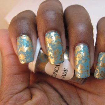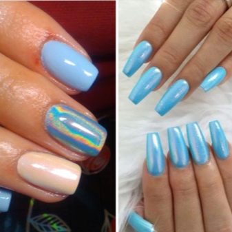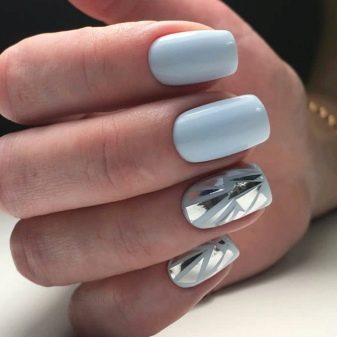 De forma blava, la decoració de làmines de diferents colors també té un aspecte excel·lent. Una solució interessant és una manicura amb paper d’or i plata, gràcies a la qual les ungles adquireixen elegància i luxe. Molts mestres no tenen por dels experiments i creen un disseny blau utilitzant no un revestiment de laca, sinó una làmina metalitzada de color celestial.