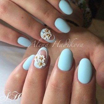 Les tonalitats del cel es faran encara més clares i aèries si s’utilitza un to mat per al recobriment. Per emfatitzar la bellesa de les calèndules amb un contrast brillant, els amos recomanen combinar un acabat brillant i un fregament de miralls en una manicura. A més, com a decoració addicional, podeu fer servir pedres de pedra, làmines i espurnes, que sobre un fons blau mat semblaran increïbles.