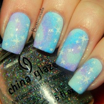 La més popular entre els fashionistes és una manicura blava amb frecs. Gràcies al joc correcte amb tons, podeu crear un autèntic "efecte espacial" amb tons inusuals. Una perla que es frega suaument les ungles en un vel sedat o setinat, una de color arc de Sant Martí omplirà el disseny amb un doble desbordament i donarà misteri, i un pigment crom mirall emfatitzarà els detalls principals de la decoració.