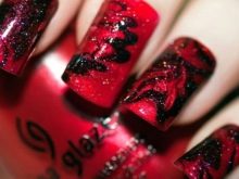 Les lluentons negres en vermell posaran èmfasi en la roba del mateix color. Aquestes dues combinacions clàssiques de colors són adequades per a dones a les que els agrada destacar davant un gran nombre de persones. Però en ungles molt llargues, aquesta opció de manicura no sembla gaire atractiva.