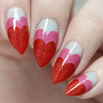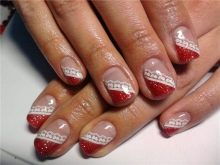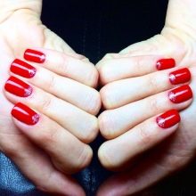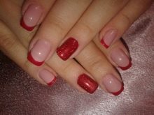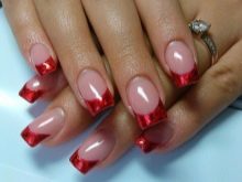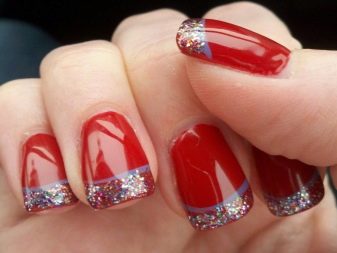Aquesta és una variant de la popular manicura francesa, però difereix de la versió clàssica per la seva brillantor. Jaqueta vermella i or: aquesta és la novetat d’aquesta temporada, que immediatament va captivar tant als dissenyadors com als amants d’una imatge luxosa. La combinació de la base vermella amb una brillantor elegant no pot sinó atraure l’atenció dels altres. Però és precisament en la variació del francès que el color vermell no es veu impudent i vulgar.