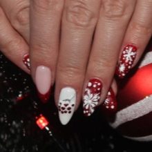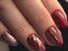 Com a imatge sobre un fons vermell de l’ungla, el millor és utilitzar imatges no molt complexes amb guspires. Decorar eficaçment no més de dues ungles. Proveu de ressaltar només un anell d'or en or. Aquesta opció no semblarà desafiant, a diferència d’un disseny similar a tots els dits. Els patrons brillants oberts i populars aquesta temporada no són fàcils de dibuixar amb un pinzell regular.