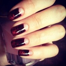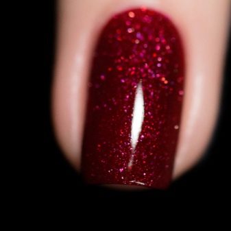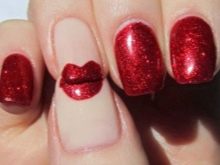 Gràcies a purpurines de mides i tons desiguals, és fàcil presentar diverses opcions. La manicura lunar està pintada o, al contrari, forats d'ungles sense pintar. També pot ser molt divers amb l'assignació atípica del forat de les ungles. Aquesta temporada, es recomana decorar el forat de les ungles amb lluentons, perquè una manicura tan brillant amb un color vermell es combina de manera harmònica amb tots els estils de roba: tant amb un vestit d’oficina com un vestit de nit.