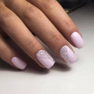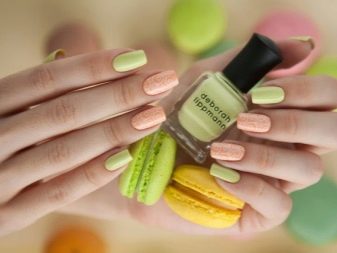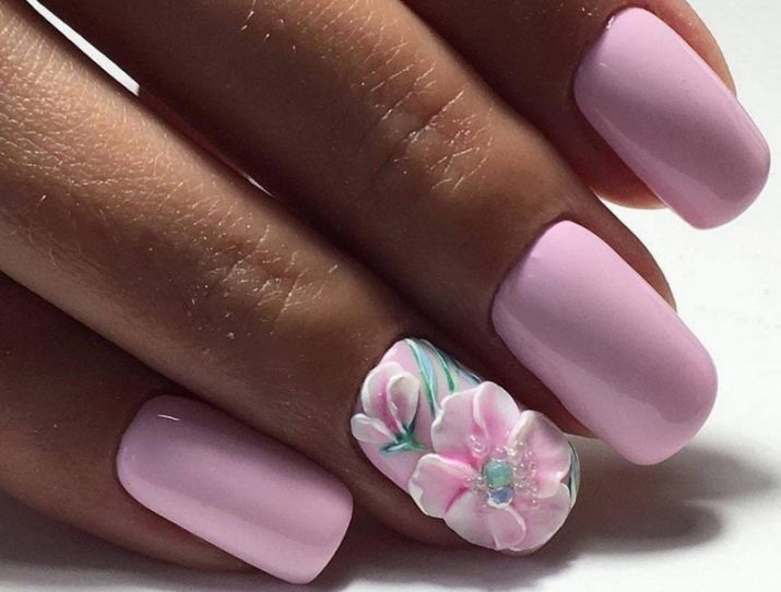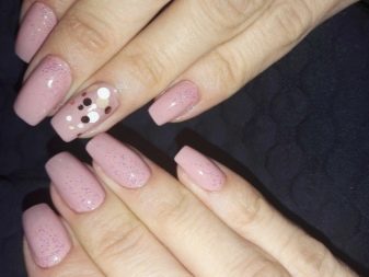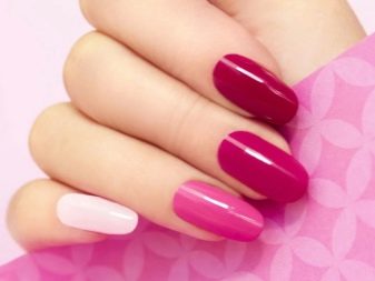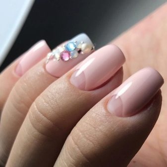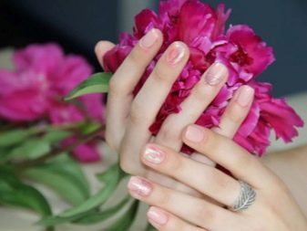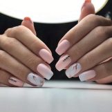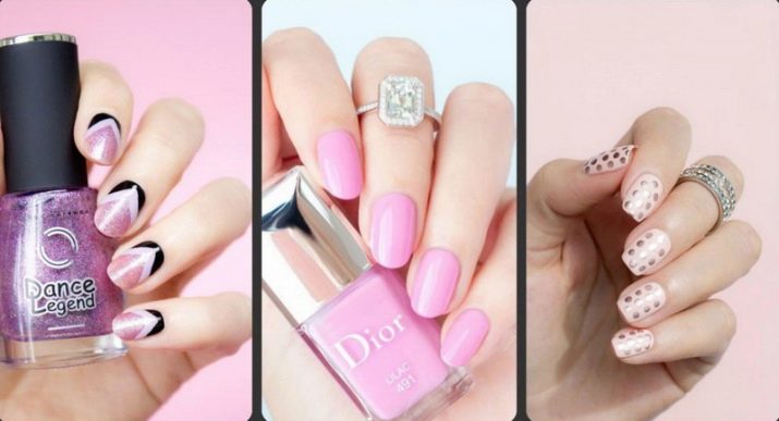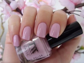 De fet, el color rosat es combina de manera harmònica amb molts tons d’escala pastel i nua, incloent una suau calç i un bronzejat. Pel que fa als tons foscos, cal tenir en compte el seu nombre: quan hi ha molta fosca a la manicura, es perd el color rosat com a fons de la manicura.