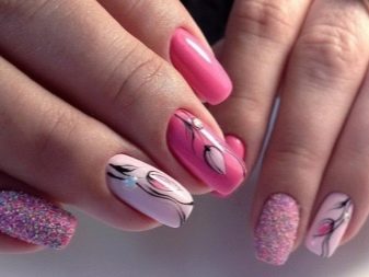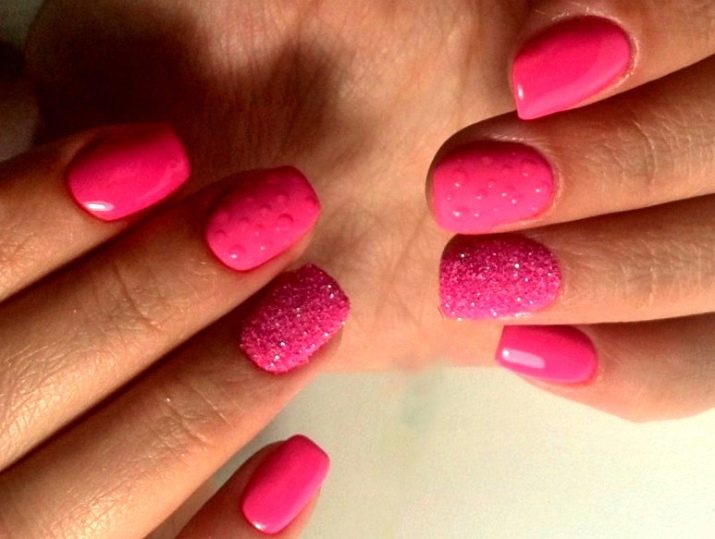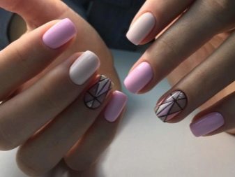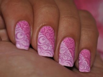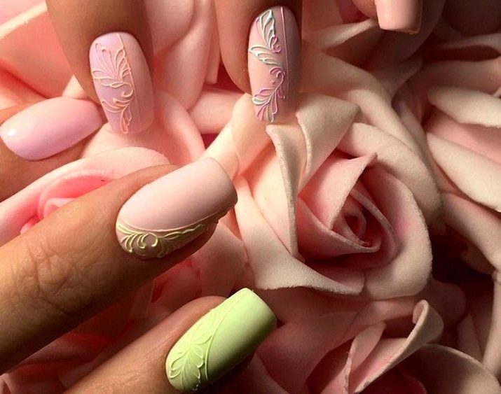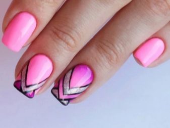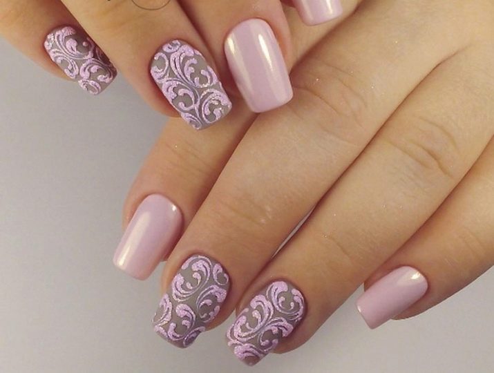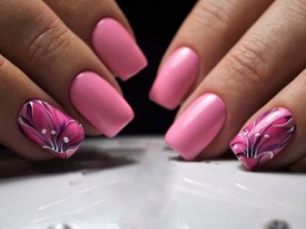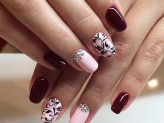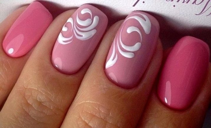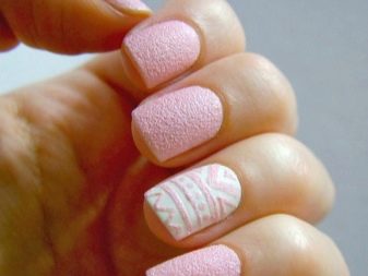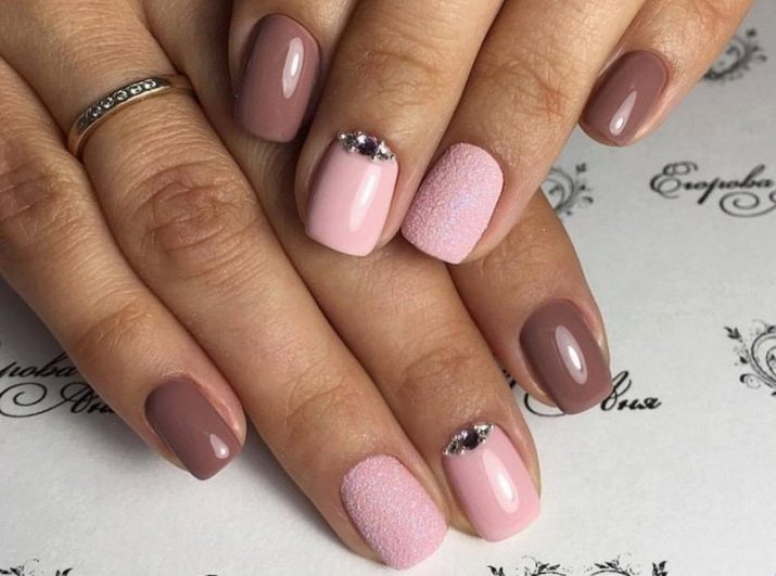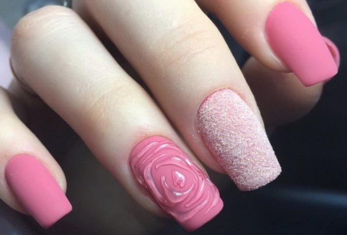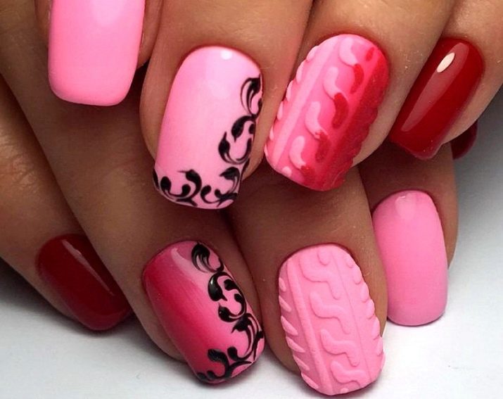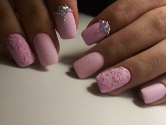 Podeu combinar diferents tipus de textures. Per exemple, una d’aquestes solucions és una combinació de recobriments mat i brillant. Un patró brillant amb rínxols o geometria sobre una base mate de l’ungla es veurà bonic. A aquells que prefereixin un tipus de textura voluminós, els agradarà les tècniques de decoració com els pols acrílics i els brous. Podeu triar aquesta decoració en una àmplia gamma. Pel que fa als tons de rosa, podeu triar opcions no només en un to relacionat, sinó també en un to idèntic.