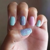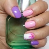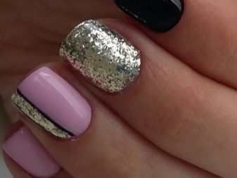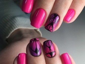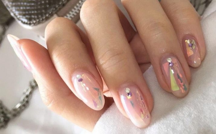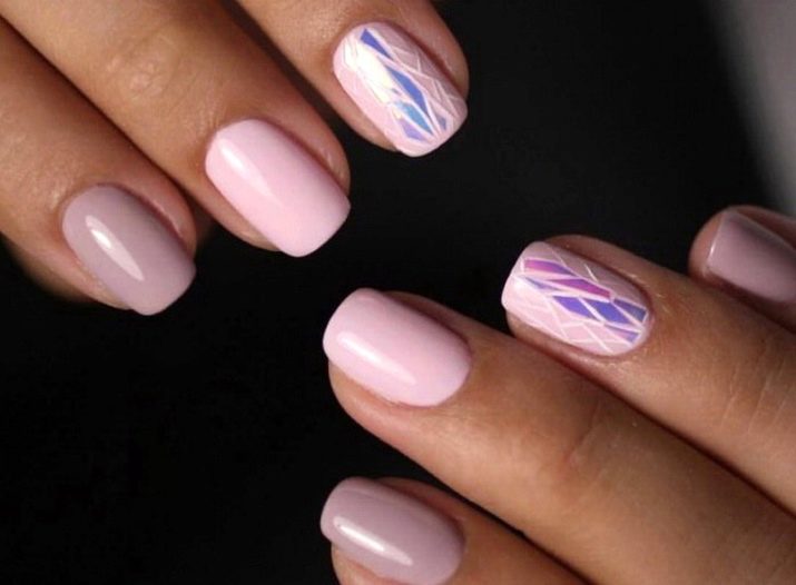 Una solució elegant i de moda serà el recobriment en la tècnica del vidre trencat. Per a aquests dissenys, s'utilitza una pel·lícula especial, que es talla en trossos petits i després es posa a les ungles, imitant diverses formes de formes geomètriques o tapant completament la superfície de la placa de les ungles. En un fons de color rosa clar, realment semblen vidres trencats, mentre que en un color rosa fosc jugaran amb tots els colors de l’arc de Sant Martí. Aquesta és una gran solució per emfatitzar la manicura.