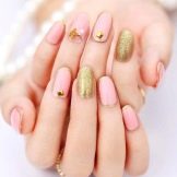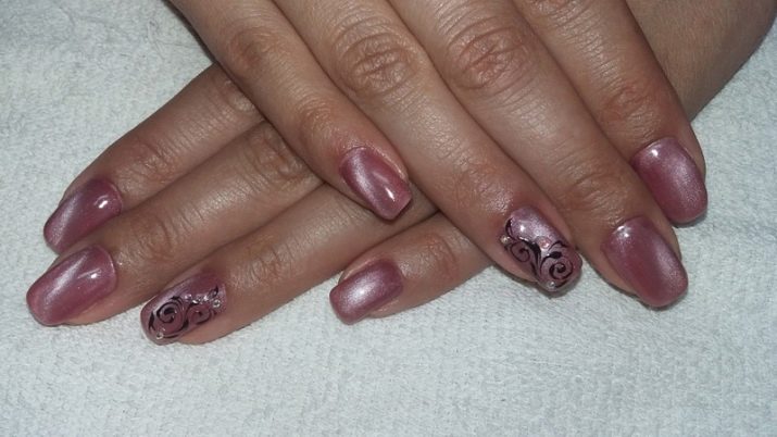 Complicar manicures amb vernissos magnètics, coneguts com a recobriments de "l'ull de gat". Avui en dia, aquests productes de vernís es distingeixen per una gran varietat de tons i textures, cosa que permet obtenir no només un disseny brillant i inusual, sinó una solució més aviat fresca que demostra la versatilitat del fons rosat principal. Una sorpresa va ser el retorn a les tendències dels revestiments de craquelura, caracteritzats per l’efecte de les esquerdes. Avui està de moda combinar dissenys d’aquests amb or o plata, aconseguint una aparença inusual de manicura.