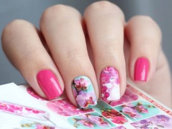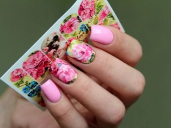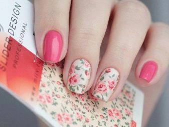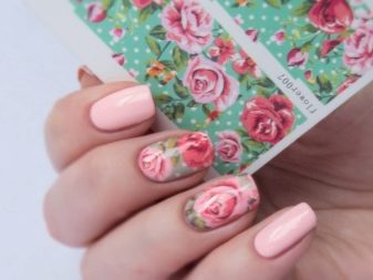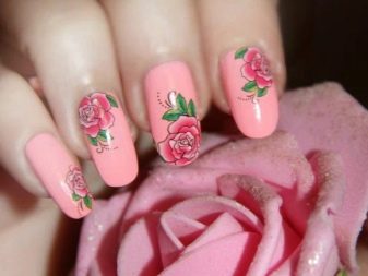 Aquesta tècnica permet batre el disseny pertanyent a una determinada temporada. Tot i això, cal triar els adhesius adequats per a la manicura rosa. Les èpoques de decoració complexa són una cosa del passat: a l’hora d’escollir un dibuix de la mateixa flor, heu d’intentar que no cobreixi completament la placa de les ungles. És important deixar l'efecte de la lleugeresa, que és impossible quan es pinta tota l'ungla.