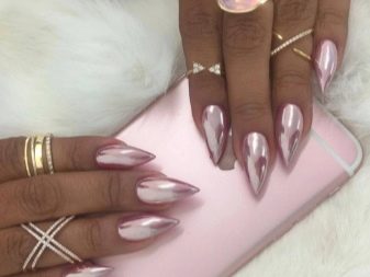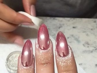 La primera joieria és una substància especial en pols amb la brillantor més fina, que es frega a la placa de les ungles, aconseguint l'efecte desitjat. Avui dia, el fregament pot tenir molts efectes, a causa dels quals les manicures rosades poden ser no només voluminoses, sinó també iridescents amb tots els colors de l'arc de Sant Martí. Avui també el paper de manicura es distingeix per una varietat de varietats entre les quals cada dona pot triar l'opció desitjada. Són especialment populars els revestiments estilogràfics i els dissenys hologràfics.