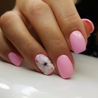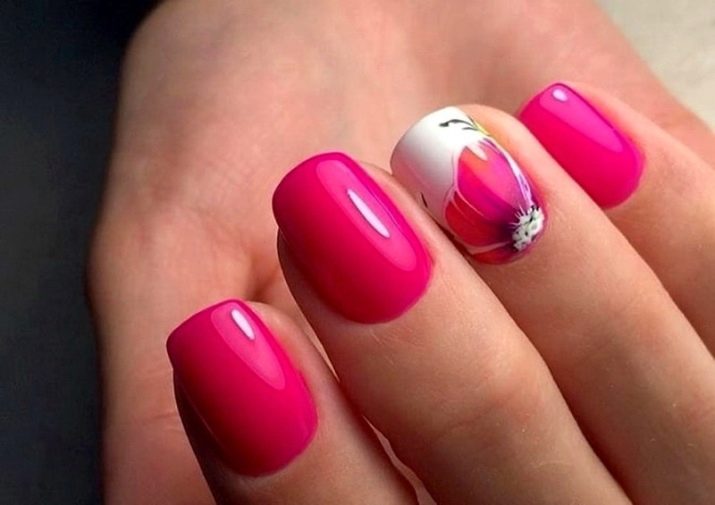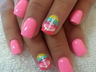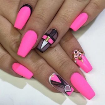 El disseny, accentuat per l’estacionalitat, transmet perfectament imatges temàtiques. Per exemple, la manicura rosa per a l’estiu es pot decorar amb una gran varietat d’estampats brillants amb imatges d’insectes (els escarabats i les marietes seran especialment populars), fruites madures i sucoses, paisatges de platja i mar. Al mateix temps, els tons de rosa per als dissenys d’estiu han de ser brillants i saturats.