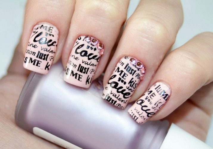 Els aficionats als dissenys d’època els agradarà el disseny d’ungles mitjançant la tècnica de manicura de diari. Sobre un fons rosat delicat, les lletres impreses tindran un aspecte elegant i inusual. A més, la manicura de diari en tons rosats preveu una decoració addicional de les plaques de les ungles. Això es pot fer amb diverses barra lliscants o petits adhesius.