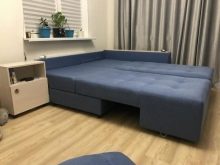 Però tot el que s’ha dit s’aplica a dissenys senzills. Els models de forma angular tenen especificitats pròpies. Així doncs, es pot muntar directament a la paret un sofà cantoner amb mecanisme extraïble. Aquesta opció estalvia espai i és adequada fins i tot per a una habitació modesta. Els sofàs de cantonada estan més sovint equipats Mecanisme tipus dofina.