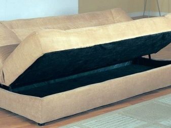 Hi ha molt d'espai lliure en un sofà com aquest. Els nínxols per emmagatzemar les coses són molt grans i no hi ha problemes on posar la roba de llit. Tot i això, els avantatges d’aquest disseny també seran els seus menys. A les butaques grans, resulta incòmode per als nens i fins i tot per a molts adults de talla curta.