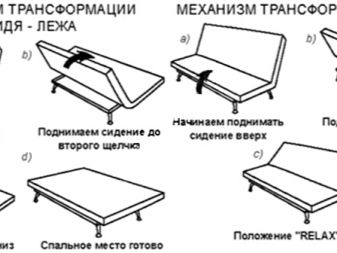Sofà tipus llibre es pot disposar en dues disposicions principals. En una d’elles s’utilitza durant el dia, i en l’altra es converteix en un lloc acabat de dormir. Per convertir el "llibre" a la zona de dormir, necessiteu moure l'esquena.
