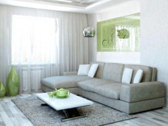 La millor elecció per a una habitació petita serà sofà sense reposabraços laterals i coixins addicionals, Un altre truc per reduir la mida dels mobles sense perdre la funcionalitat és comprar o ordenar un disseny sense potes. Les possibilitats d’ús seran una mica limitades, ja que en un sofà és difícil de netejar, però aleshores la seva mida serà mínima.