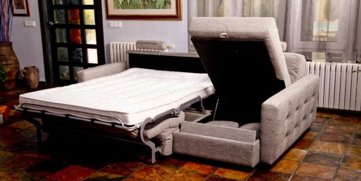 Igual que els models de clamshell, l'acordió té una mida molt compacta quan es munta, és convenientment instal·lat en sales petites. Un altre avantatge important és la presència d’una tauleta de nit situada a la paret posterior del moble. Els mecanismes de lliscament "Acordió" estan equipats amb elements de treball fiables, tenen una llarga vida útil, resisteixen a un pes important, són fàcils de transformar, però també tenen un inconvenient - Al lliscar els suports es llisca per terra i pot danyar el recobriment.