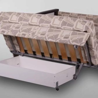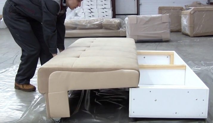 - S'haurà d'aixecar el seient. A continuació, desenrosqueu tots els fixadors i pinces disponibles de l'estructura i traieu les caixes d'emmagatzematge de la roba de llit.