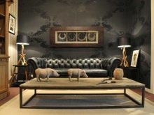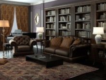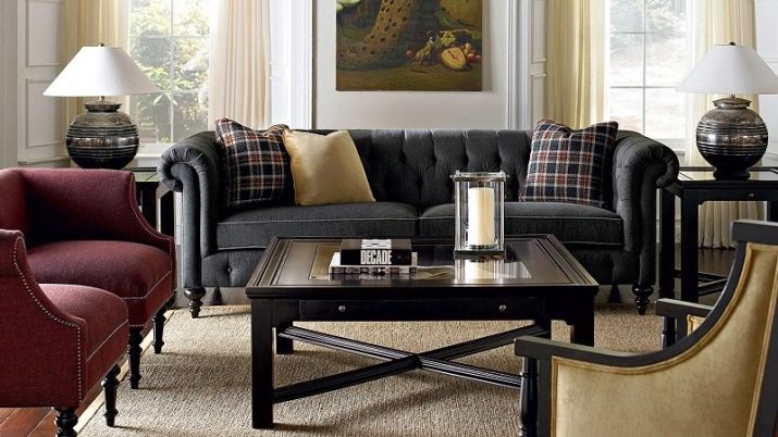 A més de l'estil, és molt important que el sofà coincideixi orgànicament de color. Com que la majoria de models de mobles entapissats tenen una tonalitat fosca, és lògic posar-lo en una habitació més clara, en cas contrari, l’habitació pot ser massa fosca. Tot i que els interiors tradicionals anglesos són sovint negres.