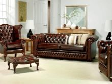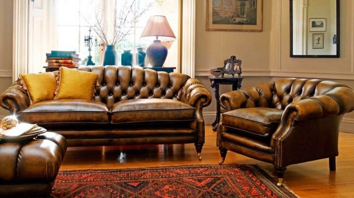 - “Chesterfield” de pell suau amb una bonica tonalitat marró bronze, sembla impressionant amb butaques i puffes similars.