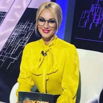 No vaig passar per la moda de la presentadora de llimona i televisió Lera Kudryavtseva. Va decidir no jugar amb altres tons, i només va afegir una brusa de moda de colors amb pintallavis brillants i ulleres en un gran marc massiu.