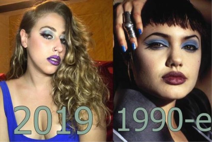 Però aquesta vegada, estilistes experimentats i maquillistes van fer sonar l’alarma - Les tendències del maquillatge dels anys 90 comencen a tornar a la moda - ombres planes, rostre brillant, llavis terribles, línies dures i dures.
