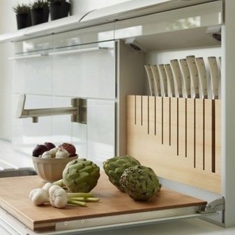 Podeu posar ganivets en un compartiment especial de l’organitzador per als estris de cuina. En aquest cas, és desitjable que les fulles (sobretot metàl·liques) dels ganivets no estiguin en contacte entre elles. Una altra opció pot ser una placa magnètica, a la qual s’adjuntarà tot el conjunt de ganivets que teniu.