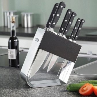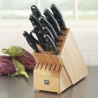 L’opció universal serà un estand especial. Feia forats separats per a cada element. La fulla es col·loca en un dels compartiments i el mànec es queda fora de dalt. Aquesta és la forma més segura i còmoda d’emmagatzemar. Tot el conjunt estarà disponible lliurement, sense interferir. El risc d’obtenir talls també és mínim, perquè per obtenir un objecte l’agafeu per la nansa. També és important que les fulles no entrin en contacte, cosa que vol dir que no hi apareixen rascades ni puntades.