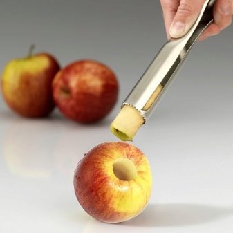 - Per tallar la cavitat. Tothom sap el difícil que és tallar el nucli d’una poma o d’una pera amb un ganivet del cuiner normal. Després aquests petits ajudants arriben al rescat. Tenen una forma cilíndrica amb les vores apuntades. Només heu d’enganxar la poma a la cola de cavall i prémer cap avall. Com a resultat, tot el nucli quedarà dins del cilindre. També es pot utilitzar per crear belles composicions a la taula festiva. Actualment, no totes les mestresses de casa de la cuina poden veure un ganivet. A les cuines dels punts de restauració pública fa temps que s’aprecia i s’utilitza, ja que el temps de cuina és de gran importància.