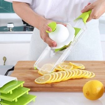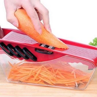 - Slicer. Es poden representar com un únic objecte o com un conjunt de dispositius (multiplicador). Exteriorment pot semblar un ratllador. Alguns models estan equipats amb un contenidor per recollir productes tallats. Aquests dispositius ofereixen oportunitats realment il·limitades per treballar amb verdures. Amb la seva ajuda, podeu picar les verdures per servir. Talleu la fruita en daus molt ràpidament i sense esforç. També hi ha elements separats amb els que rallar o tallar patates i altres verdures.
