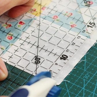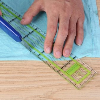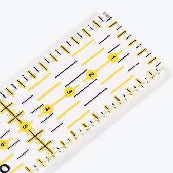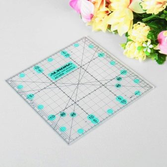 - 6,5x6,5 - l'eina de dimensions equilàters té un quadrat de marcatge addicional al mig del regle. El model és convenient utilitzar-lo per tallar la tela en diagonal, així com per crear solapes quadrades i triangulars.