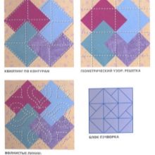 Per crear llençols de llit "a tu mateix" a partir de solapes a l'estil de patchwork, és habitual utilitzar esquemes de muntatge simples. El més senzill és cosir una manta lleugera de quadrats, que després de tallar es combinen entre ells en un ordre lliure. Tot i això, és possible fer aquest producte tèxtil bonic també amb draps de diferents formes i dimensions. Un component obligatori de les catifes d’estil patchwork és la presència de punts de punt, connectant, per regla general, tres capes: revestiment, aïllament i patchwork decoratiu. Aquest element pot ser arrissat o senzill. L’acolchament es realitza mitjançant costures a mà, cosint amb bucle o “cabra”. En els darrers anys, la puntada figurada més sovint al llarg del contorn, s'ha realitzat en una màquina de cosir.