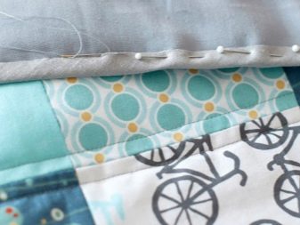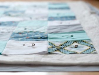 El treball amb el costat equivocat del llençol es pot produir d'una manera una mica diferent. En aquest cas, el revestiment de la mida requerida es posa "de cara" cap avall sobre una superfície horitzontal, es col·loca un escalfador al seu damunt, que, al seu torn, està cobert amb un drap de patchwork mirant "cap amunt". La funda està fixada amb passadors a les cantonades dels quadrats de cada fila. A continuació, la plaid es cola amunt i avall en un dispositiu especial i les línies haurien de posar-se en les costures que connecten les figures individuals o bé anar paral·leles a aquestes. Després, traient els pins, podeu enganxar el recobriment al llarg del contorn.