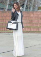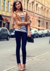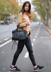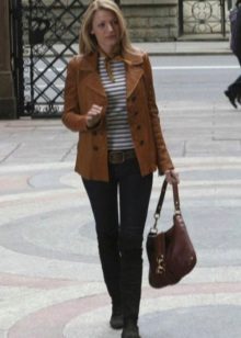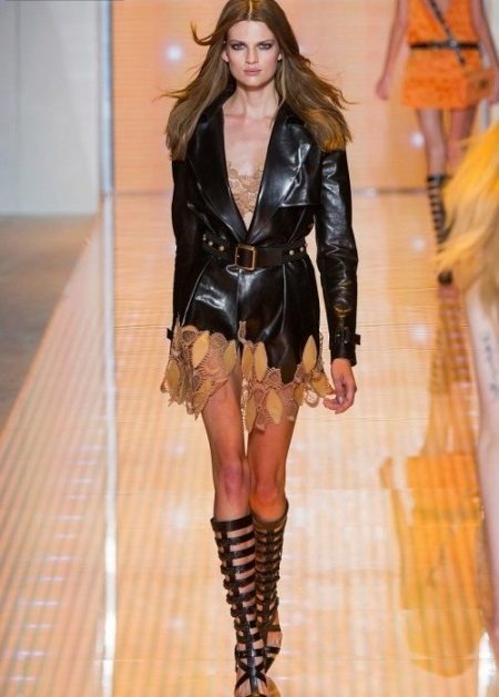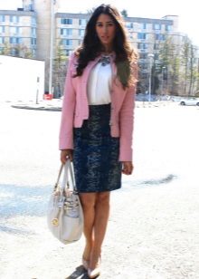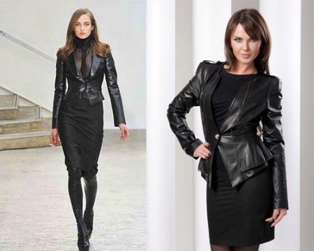 Per regla general, els estilistes aconsellen utilitzar només un article de pell en el kit. Però de vegades, amb un enfocament hàbil, es combina una jaqueta de pell orgànica, per exemple, amb una falda o pantalons de cuir. Però cal fer un esforç per diluir aquest kit correctament. Per exemple, una part superior o una brusa de punt fabricada en teixit prim i no permetrà que el kit sembli pesat i agressiu.