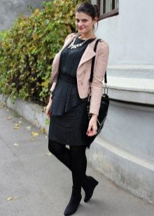 La imatge casual d'una dona de negocis és un vestit estricte de color negre i una jaqueta retallada de cuir d'un tall inusual.