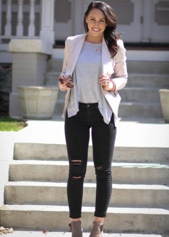 Al final, no es pot ignorar la indubtable tendència dels darrers anys: es tracta d’una jaqueta combinada. La combinació adequada donarà un aspecte impressionant. Per exemple, la clàssica severitat del model a partir d’un teixit de vestuari normal s’actualitza amb les mànigues de cuir per combinar. Un abric més lliure d'estil serà una jaqueta d'un teixit de vestit en una gàbia, complementat amb mànigues de cuir llis al to d'un dels colors de la gàbia. Sovint, la combinació de cuir s’estén fins a l’acabat de les butxaques i el collar, cosa que proporciona a la imatge un encant especial.