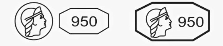 - 950. en un sistema de quirats, 23 quirats. Un aliatge en què un 95% de platí i un 5% de impureses. Té una brillantor brillant i gran resistència. Al distintiu d'aquesta prova poseu el PT950. Les principals matèries primeres per a la indústria de la joieria, les dentadures, monedes de souteres.