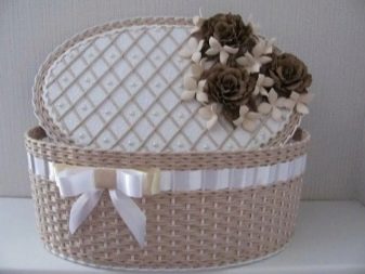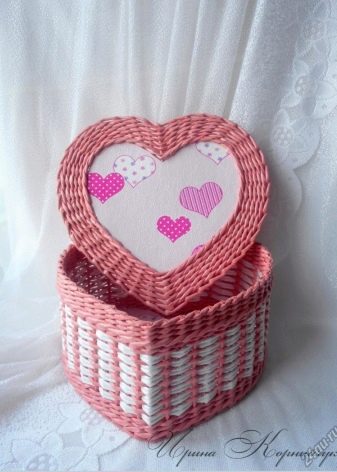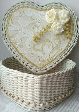 Són populars els arquetes en forma de cor. El fons d'aquesta caixa està tallat en forma de cor a partir de cartró dur o contraplacat. A més, li fan una decoració per tancar els extrems dels bastidors enganxats. Teixir amb qualsevol patró cap amunt, observant la forma del cor el màxim possible. La coberta d’aquest quadre està feta de manera similar a la part inferior. Trena la peça d’una de les maneres. És aconsellable decorar una caixa amb forma de cor amb flors, cintes, perles i moltes altres, cosa que és suficient per a la imaginació de l'artesana.