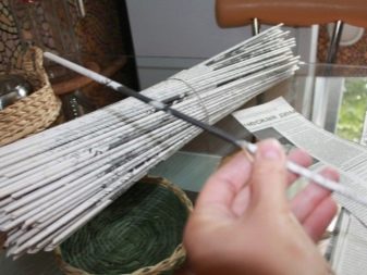 El primer pas de l'obra és l'adquisició de tubs. Segons la mida del cofre creat, des del diari es preparen 200-400 tubs. Per fer un tub, talleu un full de diari estàndard desplegat a través de la lletra en 4 parts. Obtindreu 4 tires amb una amplada d’uns 10 cm. Per torçar els tubs, poseu un pal o una agulla de punt a la cantonada d’un paper de menys de 30-45 º.