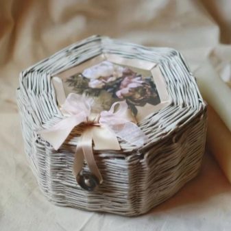 Pintar la peça d'acord amb el disseny de la caixa seleccionada. Algunes dones artesanes teixeixen un cofre monofònic amb foscos del mateix color. Podeu decorar el producte amb tires de tubs de color contrastat.Una alegre caixa de diversos colors sortirà de tubs sense pintar, retorçats de tires d'un diari de colors. Per a la tinció s’utilitzen diversos mètodes.