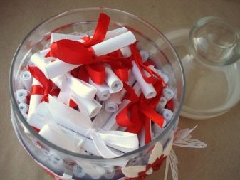 - Banc "100 raons per al meu amor" - es tracta d’un flascó normal o inusual en què hi ha petites notes en la quantitat indicada. Cadascun indica una raó per la qual estimes una persona: uns ulls bonics, una barba magnífica, un caràcter amable i flexible, talents, sexualitat, etc.