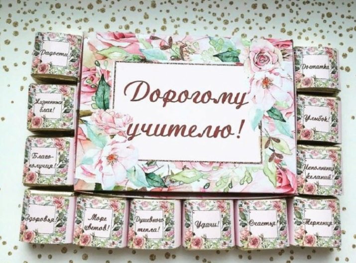 Com a regal saborós, podeu presentar una caixa gran amb una gran varietat de bombons. Hi ha botigues especialitzades en la venda de xocolata alegre de formes i colors interessants. Podeu demanar una caixa personalitzada amb xocolata per al professor. A l'interior hi ha moltes peces de xocolata, sobre les quals s'imprimirà una carta. El preu varia segons la mida del text. No és necessari donar només xocolata, sinó que podeu comprar un gran conjunt de dolços orientals.