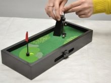 - Golf de taula. Un modern joc de taula en què es pot lluitar a casa i a la feina. Els pals i pilotes d'hoquei en miniatura s'assemblen a l'original, només de mida reduïda. Amb ell, el teu amic podrà sentir-se implicat en aquest esport d’elit i relaxar-se amb una festa interessant.