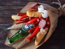 - Ram comestible d’embotits i productes de formatge. Per a l’obsequi, necessitareu embotits prims en una broqueta, formatge fumat en forma de gallina, i com a càrrega semàntica i una fina insinuació, afegiu-hi un pebre vermell calent i fort entre el formatge i les botifarres. Un regal semblarà bonic si està embolicat en paper kraft.