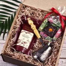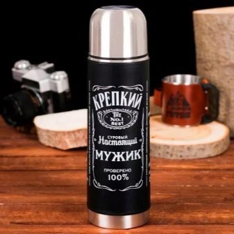 Els representants de vendes ofereixen ara kits interessants amb petites ampolles d'alcohol car de qualitat. Se li afegeix xocolata i, per exemple, mandarines. Una bona opció seria un matràs de record amb gravat o en un cas interessant. Una petita ampolla termos d’una forma original també agradarà a un empleat masculí.