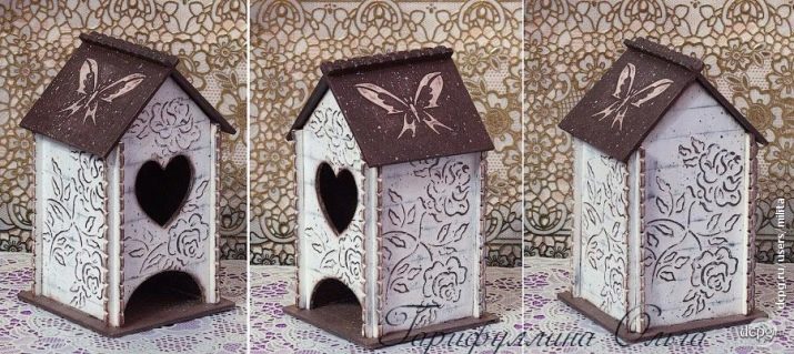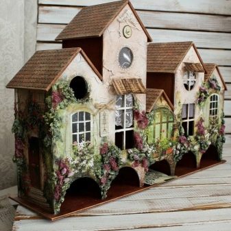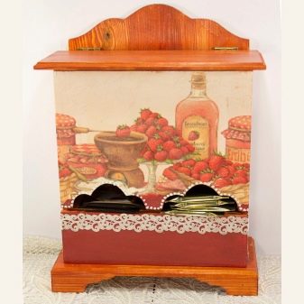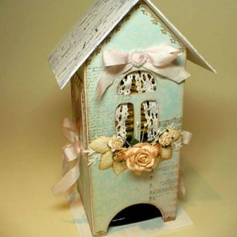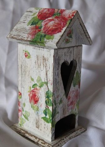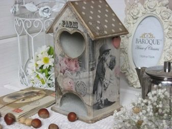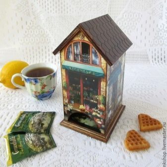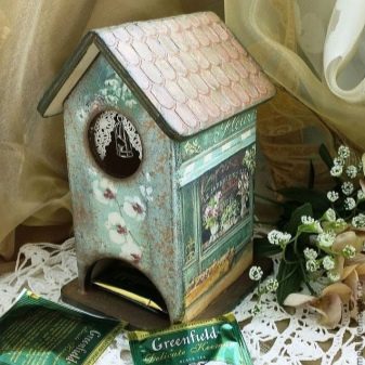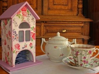 Avui en dia, hi ha moltes idees per al decoupage d'una casa de te, no només els temes del te, sinó també motius florals retro, són especialment populars. Un producte decoratiu d’aquesta manera s’adapta perfectament a qualsevol disseny d’habitació i proporciona a la cerimònia del te un ambient especial de comoditat.