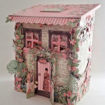 - Casa amb estil vintage. Per al seu disseny, s’utilitza un tipus especial de treballs d’agulla, que s’anomena scrapbooking. El vestit en aquest cas es realitza amb encaixos, cintes i pedres de pedra, fixades a la superfície de la casa amb cola. Aquesta casa té un aspecte especialment elegant amb cordons blancs i perles rosades.