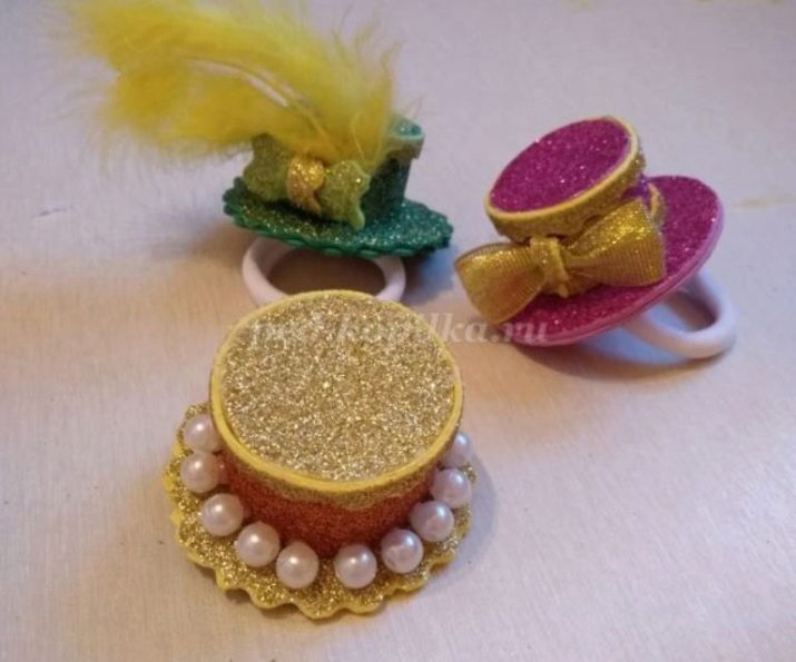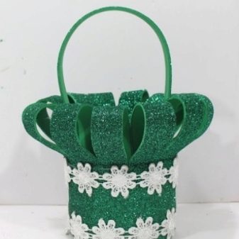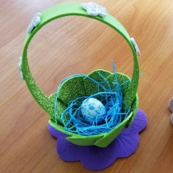 En el primer cas, heu de donar al material la forma de copa necessària i, en el segon, crear una base sobre la qual s’han d’adjuntar tires de diversos colors. Recordeu també la creació d’un bolígraf. Una cistella de foamiran purpurina pot complir tant un paper merament decoratiu com funcional (per exemple, podeu posar-hi un regal).