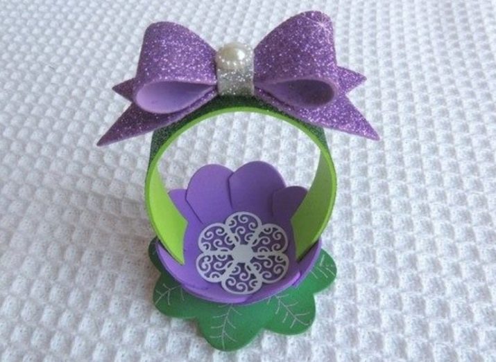 La base de la cistella es pot crear holísticament (en aquest cas necessitareu una peça gran de foamiran purpurina) o feta de diverses parts (per exemple, a partir de tires, i la cistella resultarà brillant i acolorida).