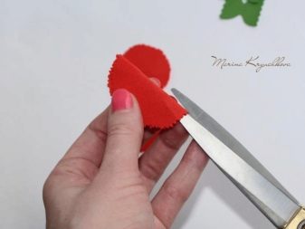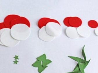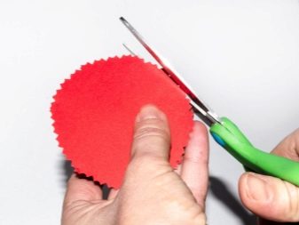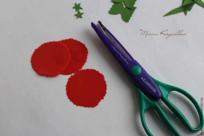 - Processar amb cura i acuradament la vora amb l’ajuda de tisores especials anomenades “vora desigual”. Si no teniu aquesta eina a l’arsenal, podeu fer les superfícies necessàries amb unes tisores simples, només necessitareu una mica més de temps lliure. Preneu els cercles blancs i pinteu les seccions de punta amb pintura escarlata amb un raspall de cervesa a dues cares.